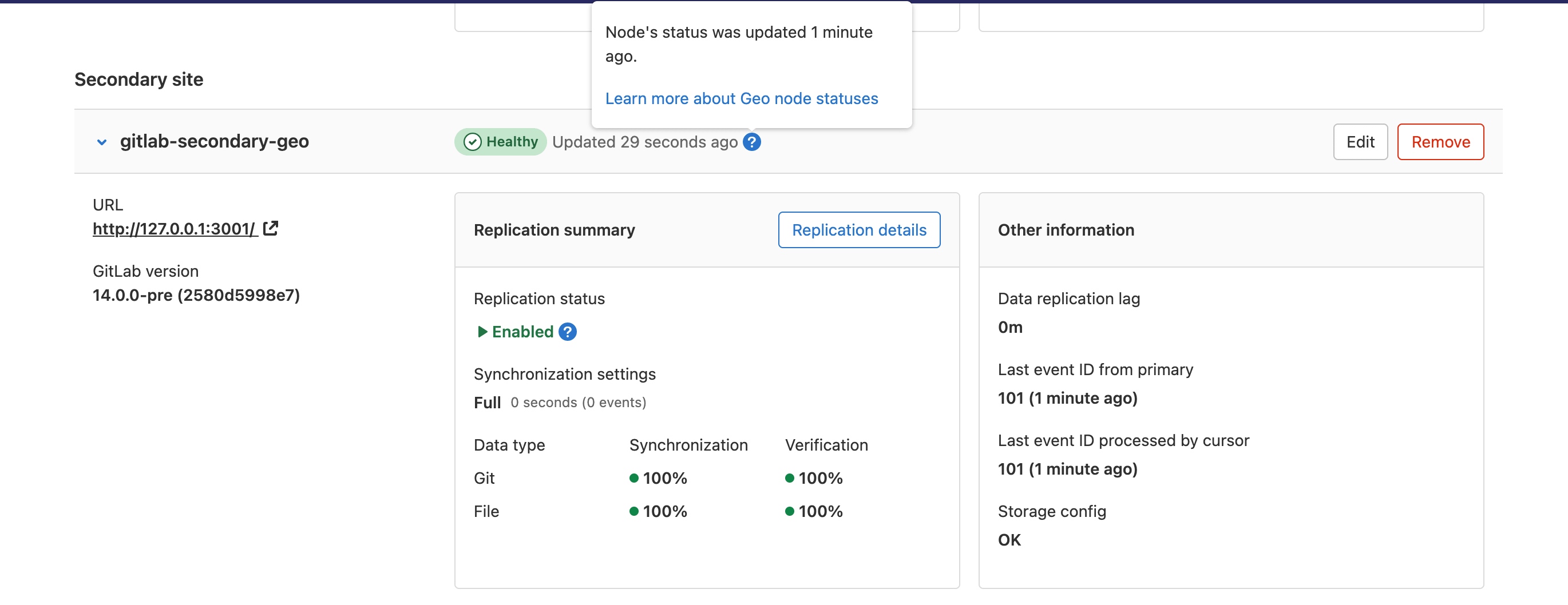 - Check `/var/log/gitlab/gitlab-rails/geo.log` to see if the **secondary** node is