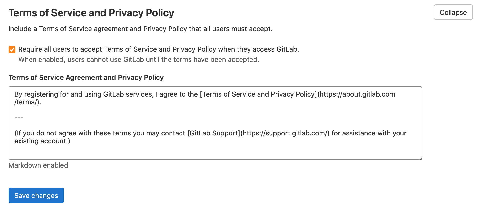 - Check the Require all users to accept Terms of Service and Privacy Policy when they access GitLab. checkbox.
