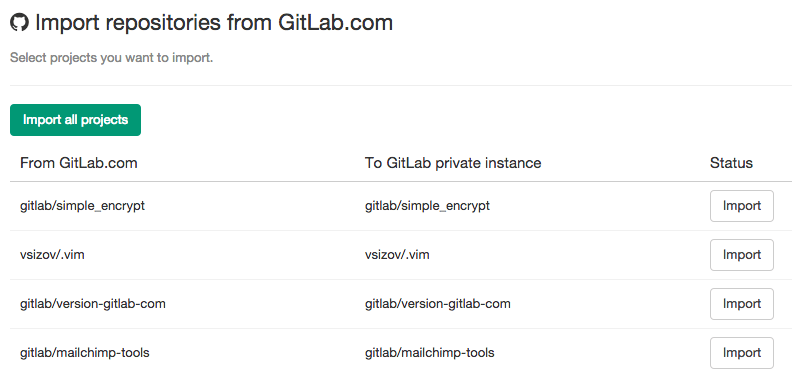 Go to the Import Projects tab, then click on GitLab.com, and you are redirected to GitLab.com for permission to access your projects. After accepting, you are automatically redirected to the importer.