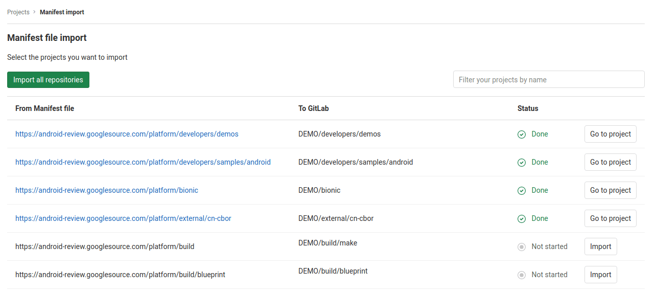 Click List available repositories. At this point, you are redirected to the import status page with projects list based on the manifest file.